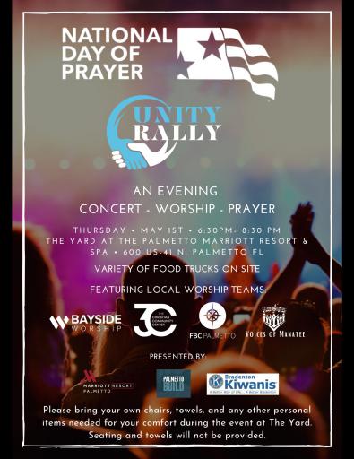National Day of Prayer event where community members, churches, and local government officials will gather for Fellowship and prayer.